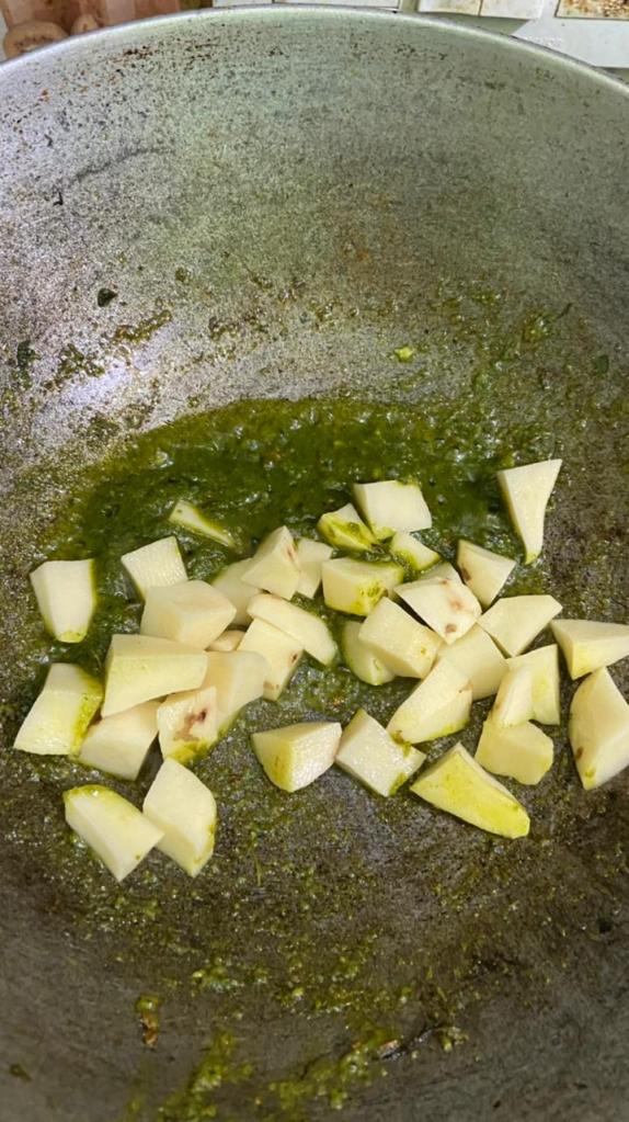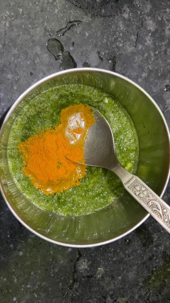 लहसुन अदरक धनिया मिर्च सब को एक साथ पीस ले और उसमे हल्दी मिलाए।